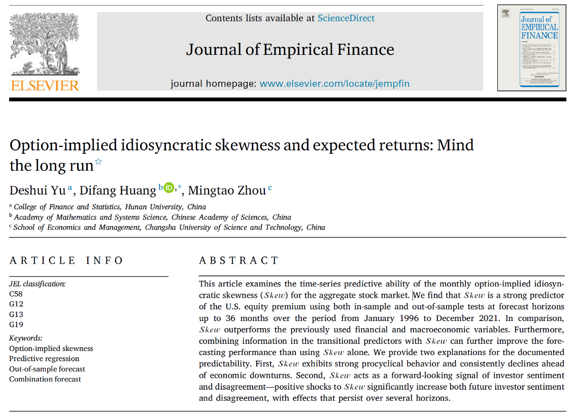 近日,五楼自拍 金融科技与工程系余得水副教授的论文“Option-implied idiosyncratic skewness and expected returns: Mind the long run”在院定A2类期刊Journal of Empirical Finance,volume 83,September2025发表。