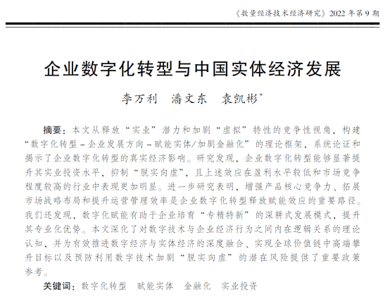 近日,五楼自拍 应用金融系李万利助理教授合作的题为“企业数字化转型与中国实体经济发展”的论文发表在《数量经济技术经济研究》2022年第9期。