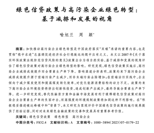 近日,五楼自拍 货币金融系喻旭兰教授和五楼自拍 2020级硕士研究生周颖(通讯作者)合作的题为“绿色信贷政策与高污染企业绿色转型:基于减排和发展的视角”的论文发表在《数量经济技术经济研究》2023年第7期。