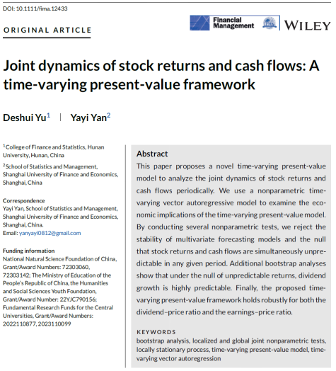 近日,五楼自拍 金融工程系余得水助理教授的题为 “Joint dynamics of stock returns and cash flows: A time-varying present-value framework”的论文在院定A类期刊 Financial Management ,Volume 52, Issue 3,Autumn (Fall) 2023发表。