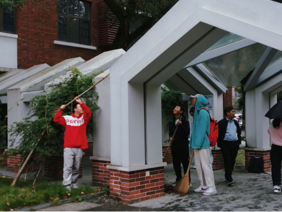 在活动的过程中,下起了霏霏细雨,但这丝毫不能影响到同学们参与清扫的热情。空调外机、屋顶、草地,同学们不放过任何一个角落,短短一个中午,院楼庭院便焕然一新。