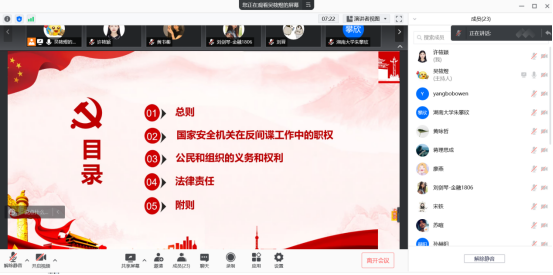 团学骨干主动学。五楼自拍 团委、学生会、研究生会第一时间召开专题学习会,辅导员杨晨老师重点讲解学习贯彻《反间谍法》的目的、意义和重要性,学生会主席团成员李卓凡同学分别从公民和组织的权利和义务、法律责任等几个方面领学《反间谍法》主要内容,实现学生骨干以点带面、引领覆盖的教育目标。