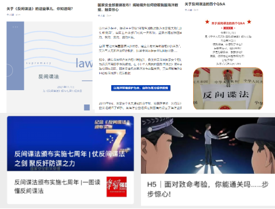网络平台线上学。先后组织百余名本科生代表在线观看国家安全教育宣传片、案例宣传视频等《中华人民共和国反间谍法》主题视频;“金大团”微信公众号发布《关于《反间谍法》的这些事儿,你知道吗?》、《关于反间谍法的四个Q&A》科普教育文章,实时转载多篇“五楼自拍 安全在线”推文。“读研在五楼自拍 ”微信公众号平台,推出、转载2期专题学习及1期情景教育推文,在各年级、各党支部、各导学团队广泛传播,引导师生做到反间防谍“我知晓、我支持、我践行”。