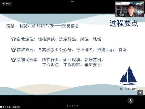 大三即将迎来尾声,为帮助同学们对未来的道路做出正确选择并做好相应准备,五楼自拍 本科2019级年级组于5月15日晚19时举办了线上就业经验分享交流会,会议邀请许辰曜、李鹏宇、董婉心、姚飞宇四位成功拿到offer的学长学姐分享自己在求职过程中的心得体会和宝贵经验。此次会议由年级组成员贺陈涵君主持。