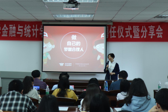 紧接着,赵静芳老师向现场同学们进行了主题为“做自己梦想的合伙人”的分享。赵老师从自己的两次创业经历谈起,娓娓道来:她创建的牛耳教育在五年时间内成为湖南省IT职业教育领军品牌,十年内实现纽交所上市;而贝尔安亲作为她的第二个创业公司,在短短六年的时间内也在全国范围内建立了800多个校区,正在向成为全国品质第一的托育公司的目标进发。她是怎样实现梦想,获得成功的呢?赵老师分享了两点她认为最重要的途径:明确人生目标,制定详细计划。只有在前方梦想的指引下和脚踏实地的努力后,才能获得成功。听了赵老师的分享,现场同学们无不深有所感。