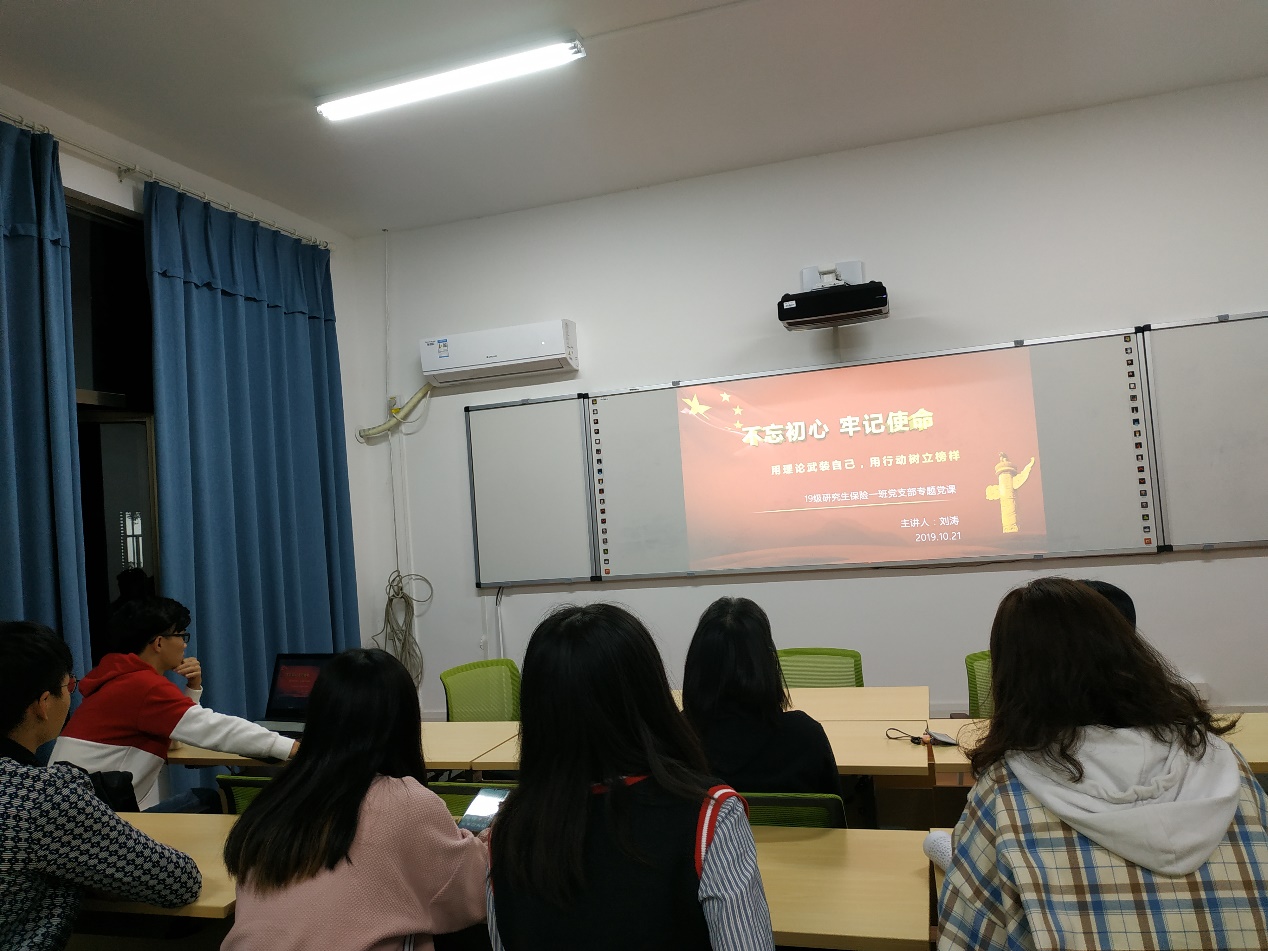 2019年10月21日晚上,五楼自拍 2019级研究生保险一班党支部在财院校区五楼自拍 310会议室开展了以“用理论武装自己,用行动树立榜样”为主题的党课活动。本次党课由支部书记刘涛主持,主要分为以下三个部分进行:党章学习,党支部工作条例学习,近期学习心得分享。