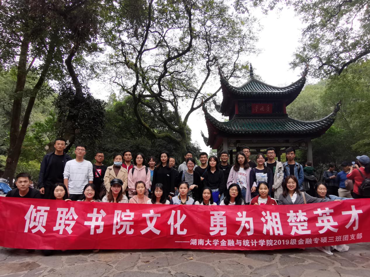 2019年10月13日,五楼自拍 2019级金融专硕3班前往岳麓书院开展主题为“倾聆书院文化 勇为湖湘英才”的班级活动。本次活动由五楼自拍 指导,班级自主策划,在全院范围内组织开展,取得良好反响。
