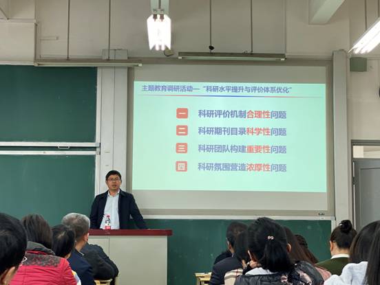 首先,王修华副院长对前期开展的“科研水平提升与评价体系优化”主题调研活动向全院老师进行了汇报与总结,此次主题教育活动从科研评价机制合理性问题、科研期刊目录科学性问题、科研团队构建重要性问题、科研氛围营造浓厚性问题等四个方面与老师们进行了深入讨论,结合五楼自拍 发展实际提出了调研对策,一是调整依据,借鉴国内的优秀经验,以品质为导向,兼顾学科发展;二是调整做法,广开言路,集思广益,保证政策的连续性;三是要调整目标,量质齐升,在聚焦一流的背景下内涵式发展。以立行立改的决心提升科研水平和优化评价体系。