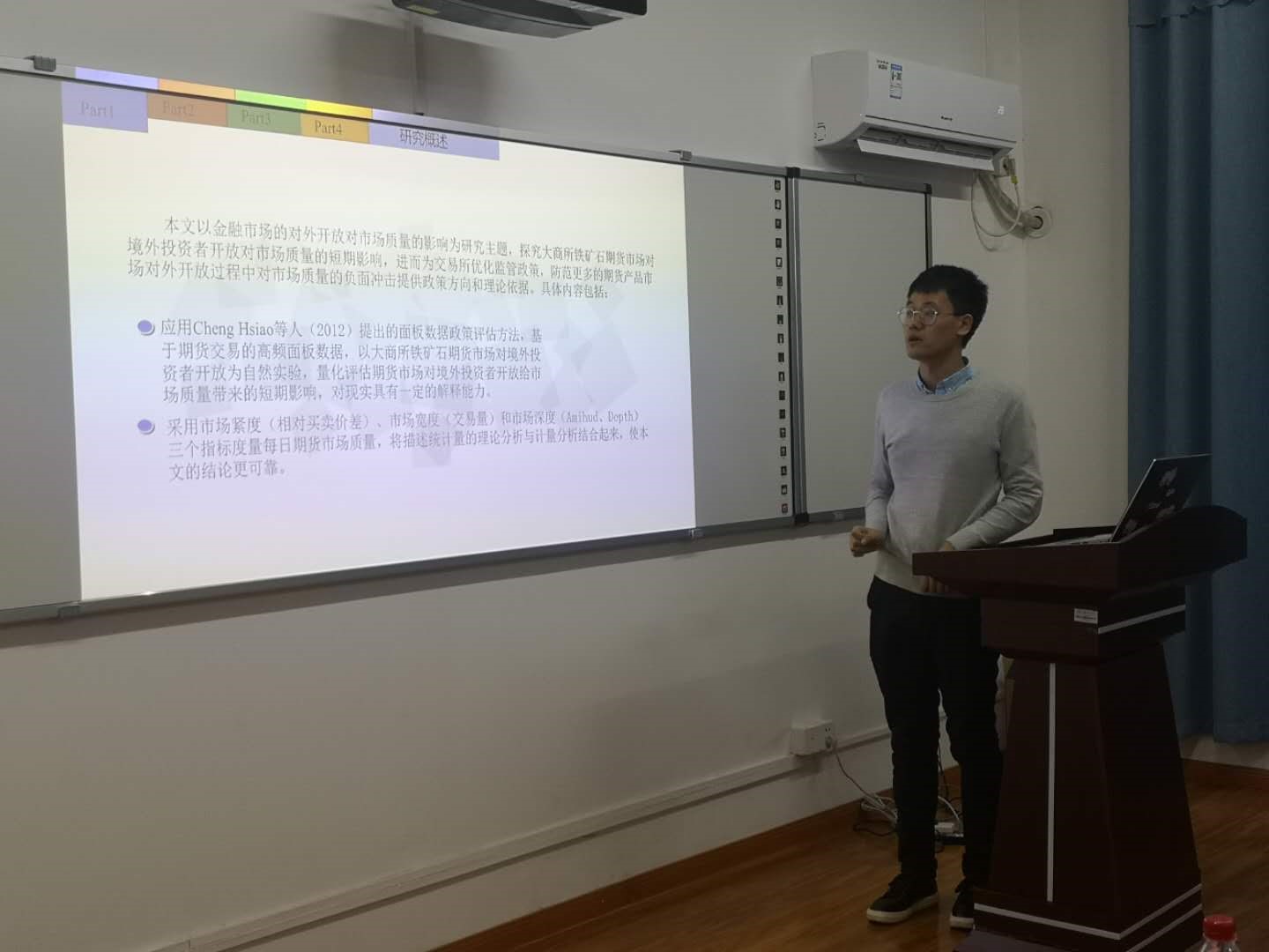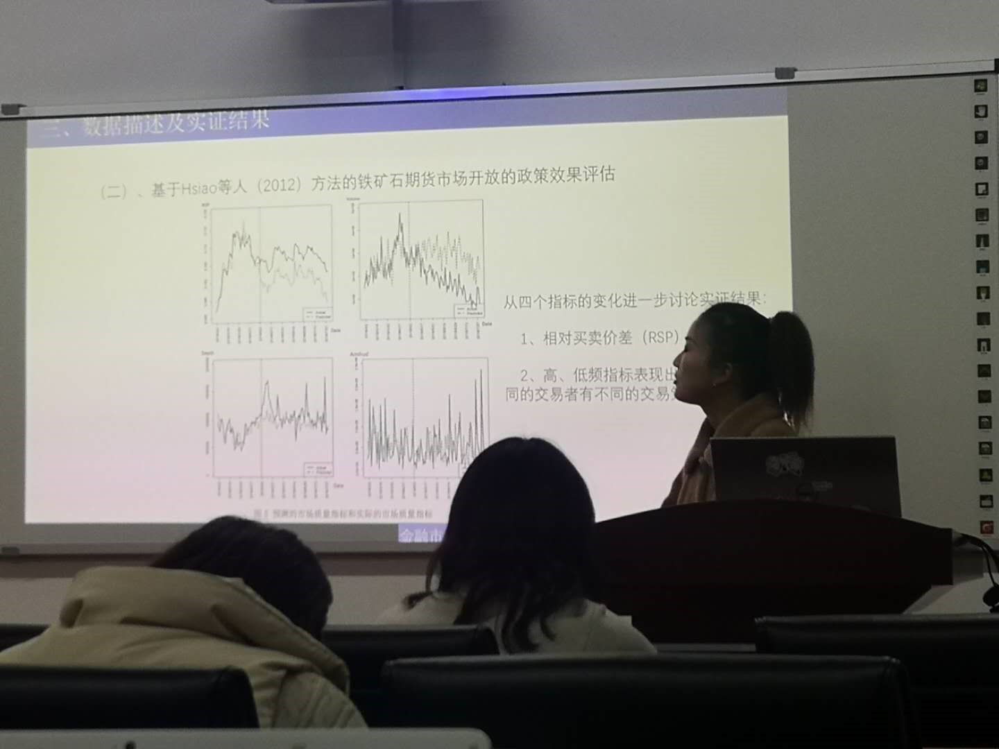 五楼自拍 王菲硕士所分享的论文主题为“金融市场的对外开放与市场质量——来自铁矿期货市场的证据”文章探究大商所铁矿石期货市场对境外投资者开放对市场质量的短期影响,进而为交易所优化监管政策,防范更多期货产品市场对外开放过程中对市场质量的负面冲击提供政策方向和理论依据。王菲同学提出文章应用Cheng Hsiao等人提出的面板数据政策评估方法,从市场紧度、市场宽度和市场深度三个方面评估铁矿石期货市场对境外投资者开放对市场质量的影响。对此篇文章,魏龙飞博士提出此研究对于我国当前加快金融业对外开放的背景,保证市场对投资者准结构变化额平稳过度和提高监管政策的有效性,具有重要的现实意义。