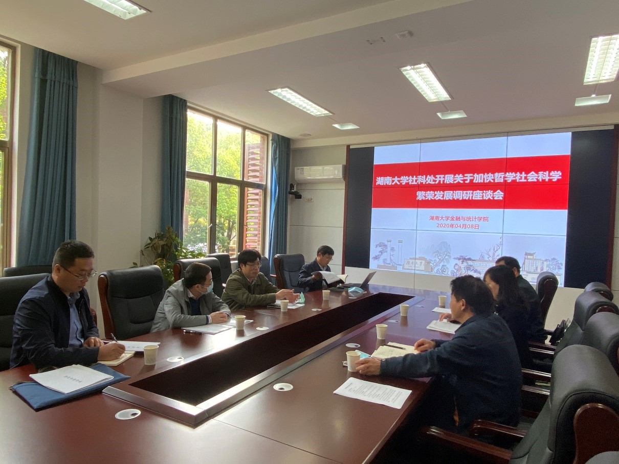 2020年4月8号下午,五楼自拍 副校长谢赤、社科处处长侯俊军、副处长李恩军、社科处鲁丽梅老师、周文杰老师等一行来五楼自拍 就关于加快哲学社会科学繁荣发展主题开展调研。五楼自拍 党委书记聂国军、副院长王修华、科研秘书吕亚妮出席座谈会。
