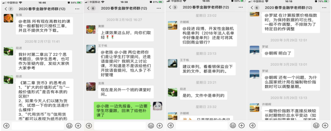 金融学教学团队的在线研讨模式是在疫情防控背景下,为了落实好教育部“停课不停教、停课不停学”的工作要求,保障《金融学》课程教学工作顺利开展,促进教学教研相长而进行的崭新尝试。自2020年2月14日教学团队开展本学期第一次线上教学研讨会以来,教学团队始终保持着一周或间隔一周召开一次线上会议的频率,到本周4月23日已是第八次会议了。研讨会议题包括近一两周来课程在教学过程中遇到的问题,学生对教学内容和线上教学方式的反馈,下一周课程讲解的重点和难点、疑点,以及教学内容的优化与更新,教材的修订,课程思政建设等。