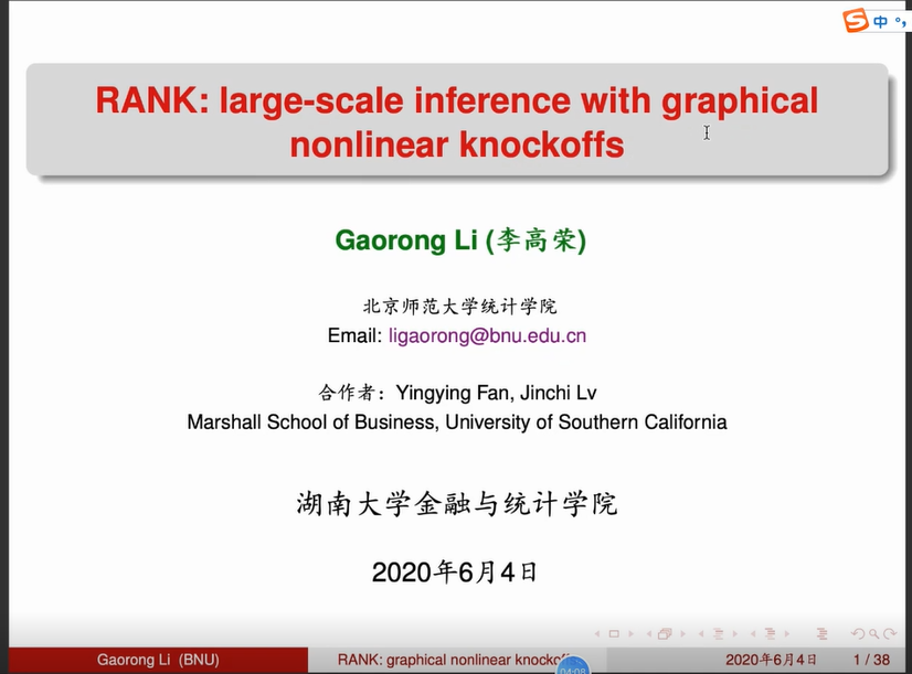 疫情期间五楼自拍 的“云上学术”气氛浓郁,2020年6月4 日第254期金融与统计论坛利用腾讯会议线上举行。本次论坛的主题是:具有图非线性防制(konckoffs)的大范围统计推断”,报告人北京师范大学统计五楼自拍 李高荣教授。此次论坛由五楼自拍 统计学系系主任谭发龙副教授主持,五楼自拍 教师及硕、博士生踊跃参与此次论坛。