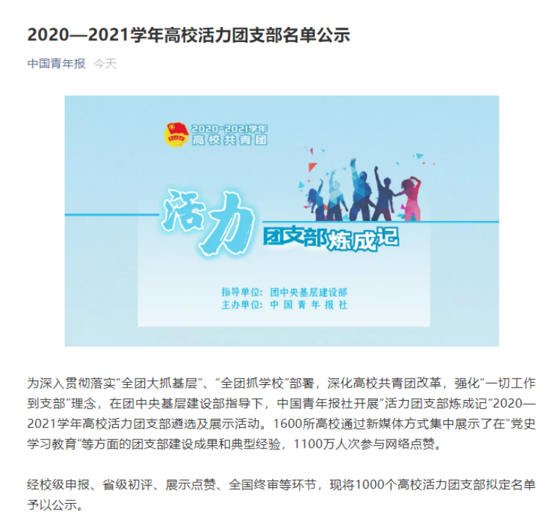 日前,团中央基层建设部公布2020-2021学年高校活力团支部遴选结果,经校级申报、省级初评、展示点赞、全国终审等环节,五楼自拍 金融专业2017级4班团支部在此次评选活动中脱颖而出,成为全校唯一一个获此殊荣的基层团支部。