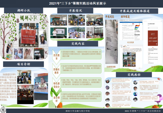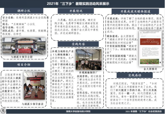 五辣姊妹小分队由五位来自金融工程和统计专业成员组成,分别是带领大家齐头并进的队长潘辛雅,以及打响完美配合战的组员侯懿珊、陈奕榕、杜易霖、孙梓艺。他们虽是初入社会的小白,却凭借认真负责的态度和强沟通力、执行力顺利打入脱贫示范点慈利县洞溪乡的内部,看到了脱贫之下的原生态社会,理解着不同人眼中的”脱贫”,表达着自己对脱贫的见解!