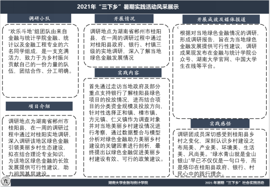 团队由五楼自拍 六名同学组成,调研地点为湖南省郴州市桂阳县,在一周的调研过程中通过实地调研,希望能够深入调研该地区绿色金融引领美丽乡村生态建设,拟在结合理论专业知识,为该地区绿色金融的长效发展提供可行性建议,用一己之力,助力祖国基层建设。
