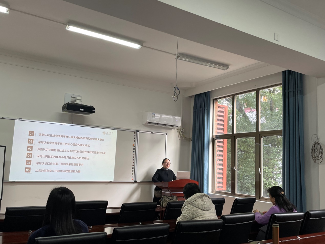 本次专题学习会议由货币金融系党支部书记刘晓兰老师主持并领学。党的十九届六中全会于2021年11月8日至11日在北京举行,是在重要历史关头召开的一次具有重大历史意义的会议。全会审议通过的《中共中央关于党的百年奋斗重大成就和历史经验的决议》是一篇光辉的马克思主义纲领性文献,是新时代中国共产党人牢记初心使命、坚持和发展中国特色社会主义的政治宣言,是以史为鉴、开创未来,实现中华民族伟大复兴的行动指南。