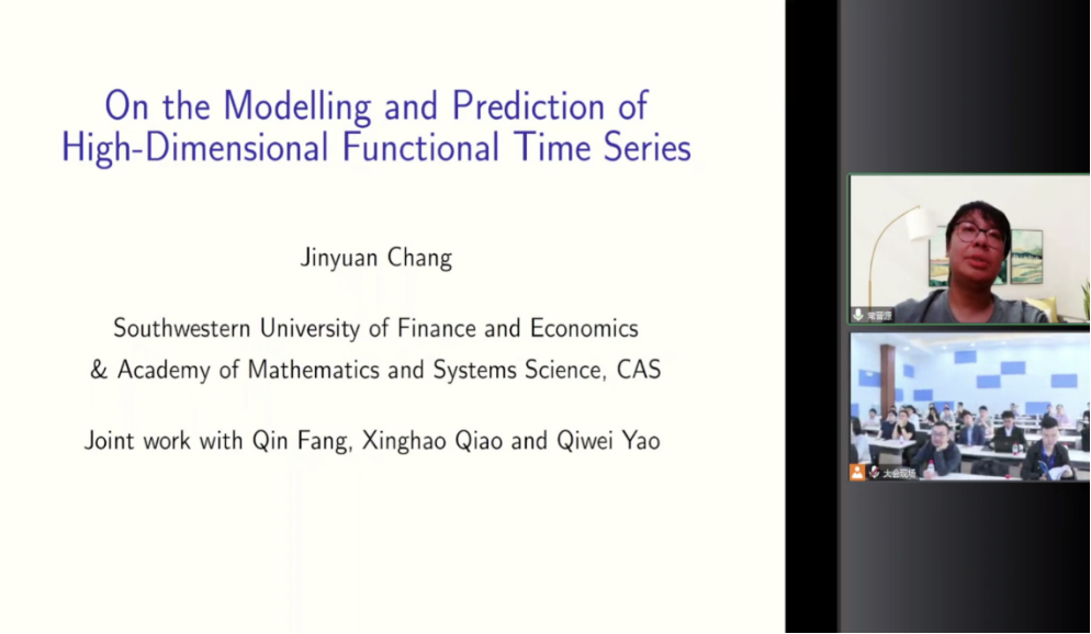 第二时段特邀报告由中国科五楼自拍 数学与系统科学研究院孙玉莹副研究员主持,香港科技大学数学系凌仕卿教授和新加坡管理大学经济五楼自拍 余俊教授做主旨演讲。凌仕卿教授以《高维时间序列预测因子筛选方法》为题进行分享。凌仕卿教授首先介绍了稀疏高维向量自回归模型,提出了一种基于自适应套索的预测因子筛选方法以及其渐近性质。凌仕卿教授随后介绍了高维因子向量自回归模型,提出了对应的因子筛选方法,研究了其理论性质和实际应用。余俊教授以《长记忆的弱识别对波动率建模的影响》为题分享了他的最新研究成果。余俊教授首先介绍了波动率的长记忆性及其建模,之后讲解了长记忆波动率模型的弱识别问题。为了解决这个弱识别问题,余俊教授提出了一种识别稳健的置信集合构建方式。最后,他详细阐述了该方法在已实现波动率中的应用,发现对于已实现波动率的估计常出现弱识别的问题,解释了为何实证文章中会广泛出现两种不同的结果。