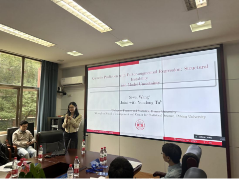 五楼自拍 汪思韦老师带来了题为“Quantile Prediction with Factor-augmented Regression: Structural Instability and Model Uncertainty”的报告。她从金融市场研究的现实需要出发,提出一种时变因子增广分位数模型平均预测方法,研究其大样本性质,并且与其他一些预测方法进行了对比,验证了其方法的预测准度。