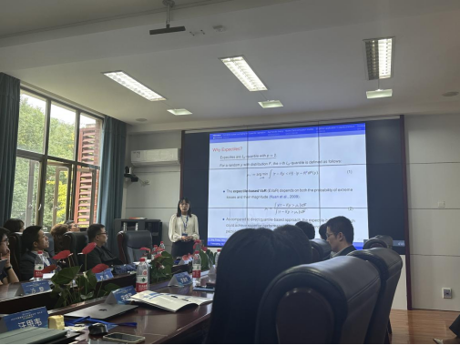 济南大学张晶博士报告了“Forecasting Tail Risk by Expectile Regression Complete Subset averaging”。张晶博士提出了利用完全子集期望分位数回归方法预测尾部风险,并从理论与实证的角度验证了所提出的方法的优越性。