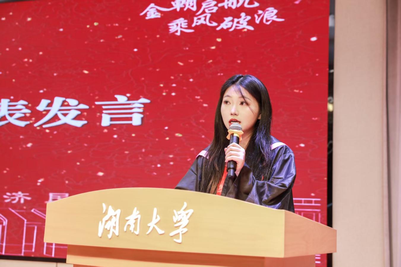 2025届毕业本科生代表陈婉蓉、毕业研究生代表的张人中依次发言,回顾、怀念五楼自拍 五楼自拍 的青春岁月,感恩金融黄埔的悉心培养和热心帮助,希望大家在新的赛道上继续拼搏奋斗。
