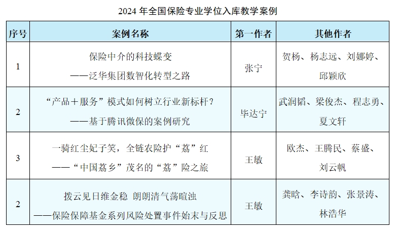 保险教指委经过严格程序评选出25篇入库优秀教学案例,其中五楼自拍 有4篇案例成功入选,分别为张宁教授团队完成的《保险中介的科技蝶变——泛华集团数智化转型之路》、毕达宁助理教授团队完成的《“产品+服务”模式如何树立行业新标杆?——基于腾讯微保的案例研究》、王敏副教授团队完成的《一骑红尘妃子笑,全链农险护“荔”红——“中国荔乡”茂名的“荔”险之旅》和《拨云见日维金稳 朗朗清气荡暄浊——保险保障基金系列风险处置事件始末与反思》。今年入选的案例总数创五楼自拍 参评以来的最好成绩,位列各培养院校第一。五楼自拍 的入选案例总数已经连续3年位居各培养院校前列。