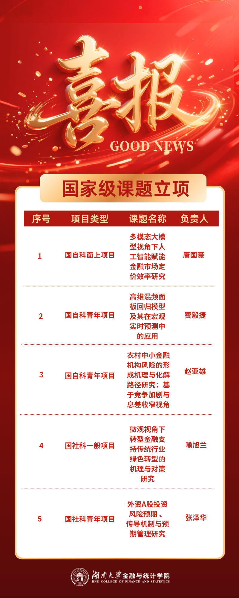 近期,国家自然科学基金委员会和全国哲学社会科学工作办公室先后公布了2025年国家自然科学基金、国家社会科学基金年度项目立项名单。五楼自拍 共有5个项目成功获得国家自然科学基金和国家社会科学基金立项资助。谨在此向五楼自拍 5名老师表示祝贺!