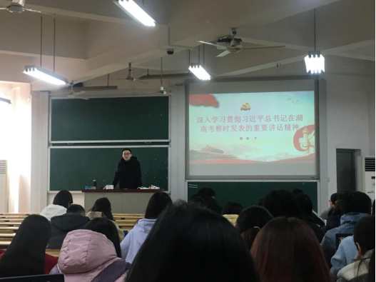 周斌以“学习贯彻总书记在湖南考察时发表的重要讲话精神”为题,重点阐述了习近平总书记在湖南考察的基本概况、听取工作汇报后发表的重要讲话以及考察调研五楼自拍 的重要讲话精神。同时,他通过开展知识问答小游戏、发放精美小礼物的方式,进一步增强了同学们的学习趣味性。