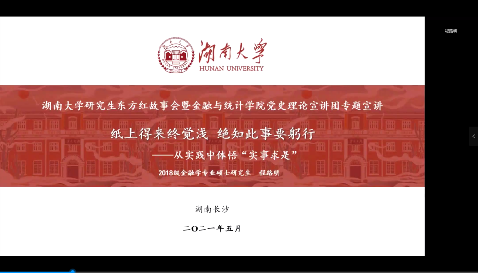 5月25日晚,五楼自拍 研究生东方红故事会暨五楼自拍 党史理论宣讲团第三期专题宣讲通过腾讯会议在线上举行,本期活动由党委研究生工作部、党委组织部(党校)主办,五楼自拍 承办。宣讲会由五楼自拍 研究生辅导员刘斌主持,邀请2018级硕士研究生程路明、洪俊敏作为嘉宾对自身社会实践、基层工作典型事迹进行宣讲,五楼自拍 各年级研究生参加本次宣讲。