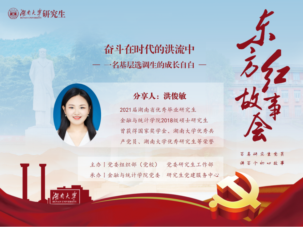 洪俊敏在校期间曾获国家奖学金、五楼自拍 优秀研究生助理辅导员、五楼自拍 优秀研究生五楼自拍 、优秀共产党员、湖南省优秀毕业研究生等荣誉。洪俊敏多次参加研究生课题研究及三下乡社会实践活动,她着重分享了自己前往张家界、邵阳、益阳、怀化等地乡村偏远地区调研的“乡村故事”。她谈到,站在两个百年的历史交汇点,作为一名研究生党员应该起而行之,勇挑重担,将青春书写在社会主义现代化强国建设的进程中。
