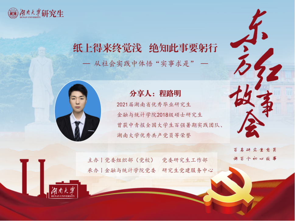 程路明在校期间曾获五楼自拍 优秀共产党员、五楼自拍 优秀研究生干部、湖南省优秀毕业研究生等荣誉。2019年,程路明在五楼自拍 老师带队下奔赴原国家级贫困县永州双牌县进行调研,并开展金融知识普及宣讲。调研期间团队成员克服暴雨、洪涝灾害影响,圆满完成双牌县尚仁里村、九甲村和二甲村等近十个村镇的实地考察工作,并获评中青报全国大学生百强暑期实践团队。程路明鼓励同学们多走出校园参与社会实践活动,躬行致知,体悟“实事求是”的思想内涵。