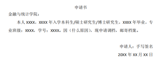 (1)参照以下格式手写调档申请书,需提供本人的真实姓名、入校时间、毕业时间、专业班级、学号等信息,以便查阅用;