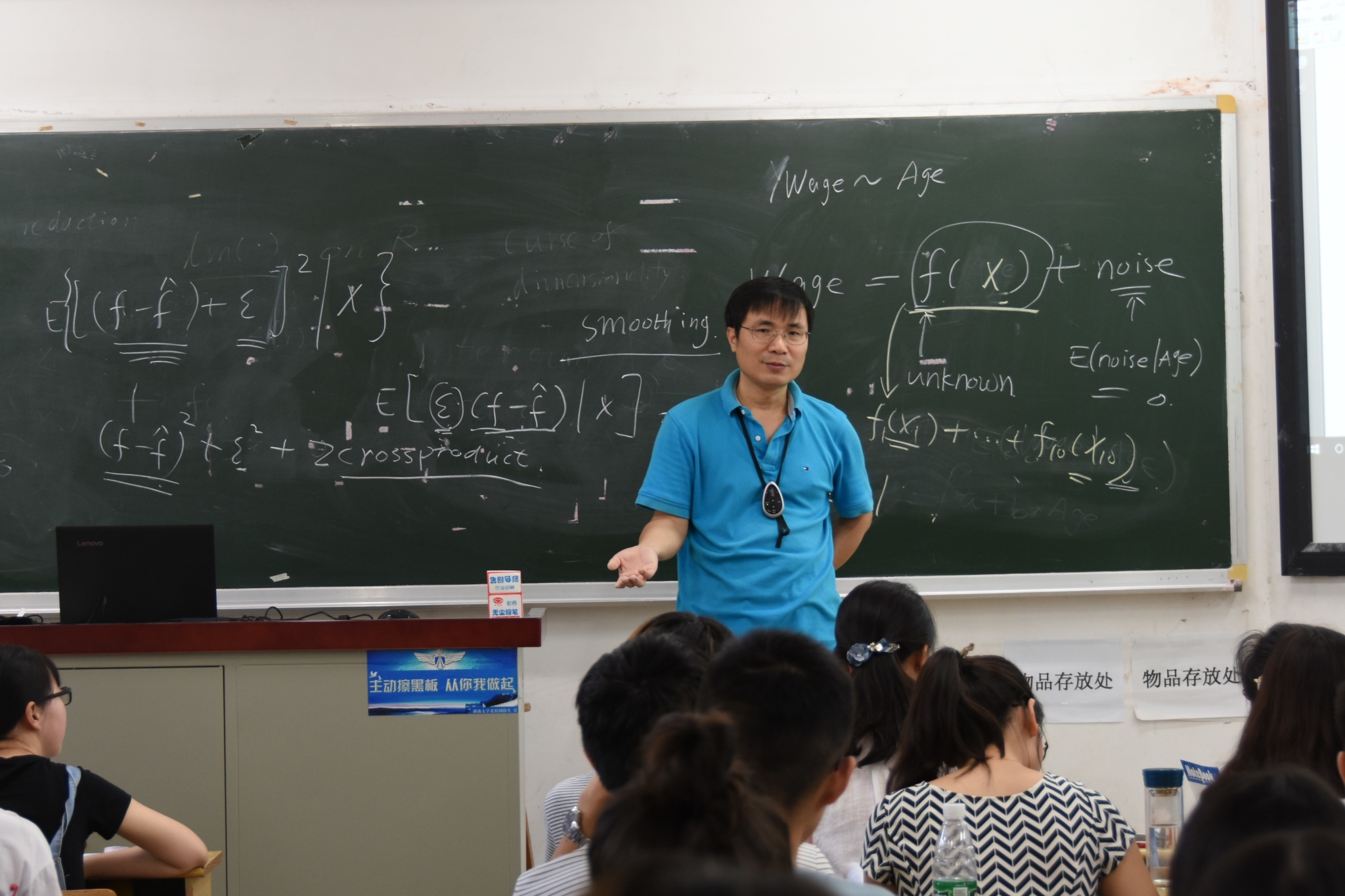 9月3日上午8:00,盛世景金融教育基金-特聘教授、来自美国北卡罗莱纳大学夏洛特分校统计学系的蒋建成老师,来到五楼自拍 ,为本科生讲授暑期海外名师全英文课程——《统计学习理论》。
